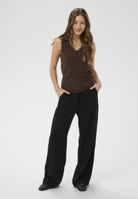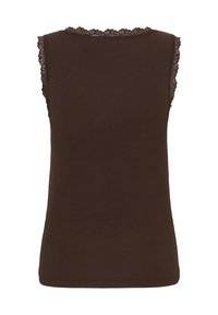 Femme portant un haut marron sans manches avec bordure en dentelle et un pantalon noir, avec des bijoux dorés, regardant de côté sur un fond uni.