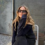 Femme aux longs cheveux blonds vêtue d'un pull ample sombre et d'un large pantalon noir, tenant un grand sac à main noir, debout devant un mur de pierre texturé.
