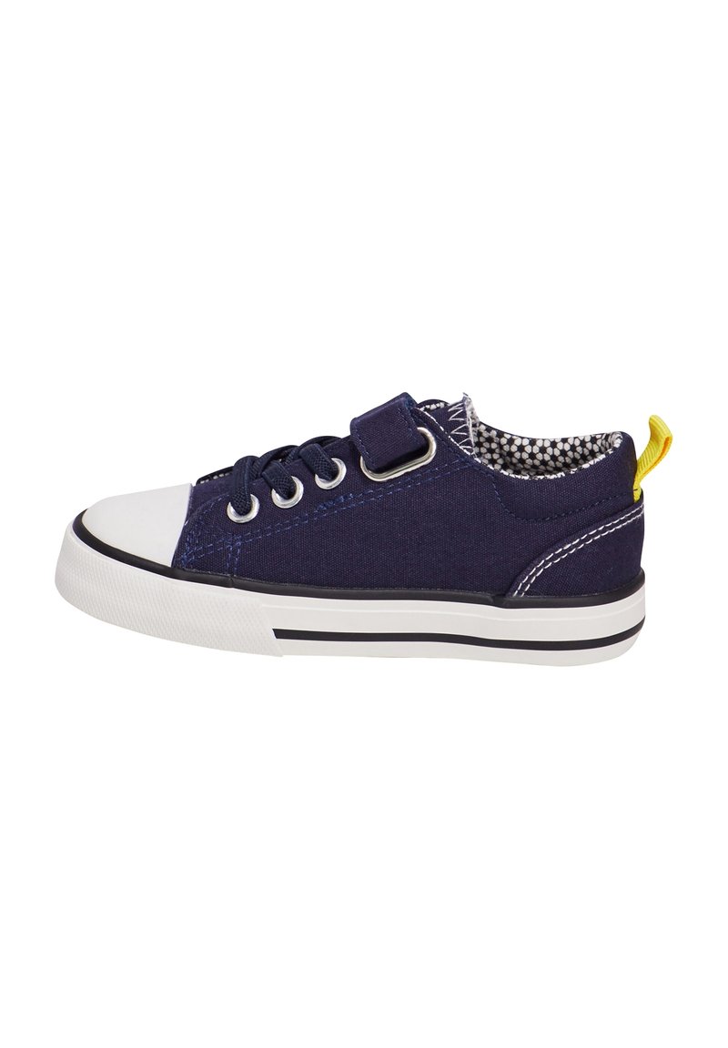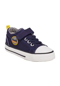 Baskets en toile bleu marine avec bout en caoutchouc blanc, fermeture à lacets à l'avant, bride Velcro, doublure intérieure à motifs noir et blanc et languette jaune au talon.