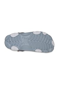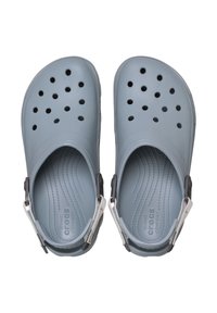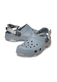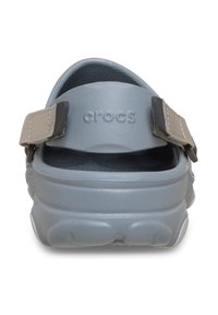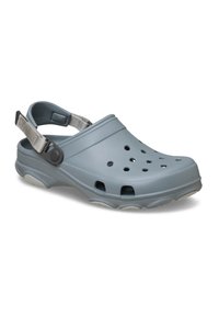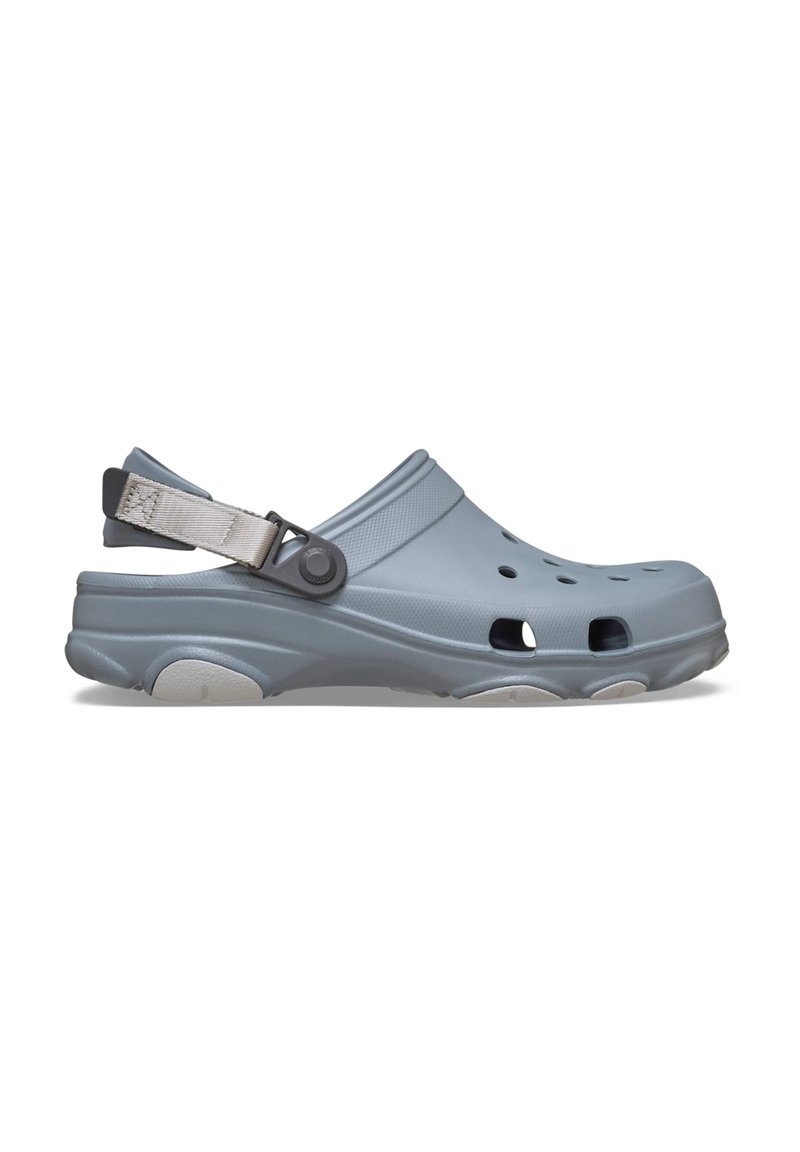 Sabot en caoutchouc gris avec talon surélevé, bride ajustable et trous de ventilation pour la respirabilité. Embout arrondi et surface texturée.