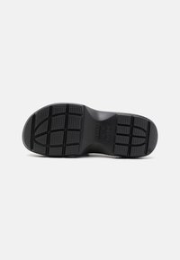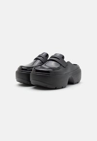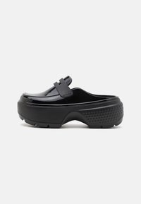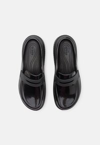 Sabot noir à enfiler avec semelle compensée, talon texturé, et une bride sur le dessus embossée du nom de la marque "Crocs".