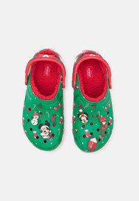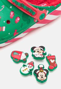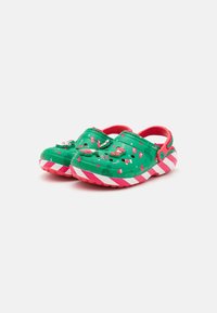 Chaussure de style croco verte avec des accents rouges. Présente des motifs festifs et une semelle rayée rose et blanche. Inclut une sangle à l'arrière pour un maintien sécurisé.