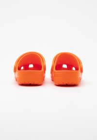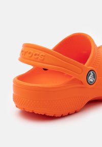 Sabots en plastique orange avec des trous de ventilation, une sangle texturée et un accent de logo circulaire sur le côté. Design léger et à bout rond.
