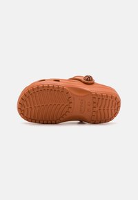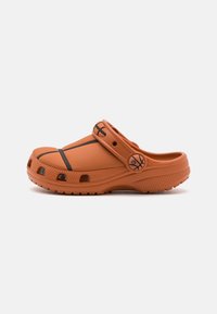 Sabot en caoutchouc orange avec des perforations, semelle en caoutchouc et une sangle ajustable. Présente un élément de design noir ressemblant à un ballon de basket.