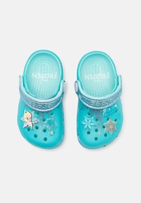 Sabot bleu aqua en matériau silicone, avec une bride argentée pailletée, des trous de ventilation et un charm flocon de neige décoratif à l'avant.