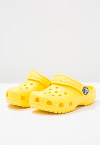 Sabot jaune à enfiler avec des trous de ventilation et une sangle au talon ajustable, arborant un logo circulaire noir avec un design de crocodile blanc.