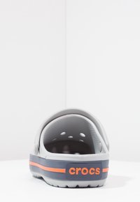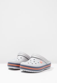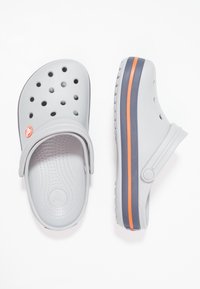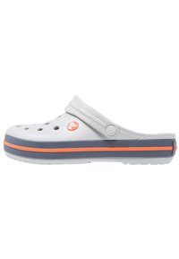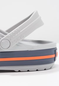 Sabot blanc avec trous de ventilation, semelle rayée bleu marine et orange, design léger et sangle pour un ajustement sécurisé. Logo de la marque Crocs présent.