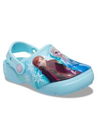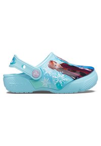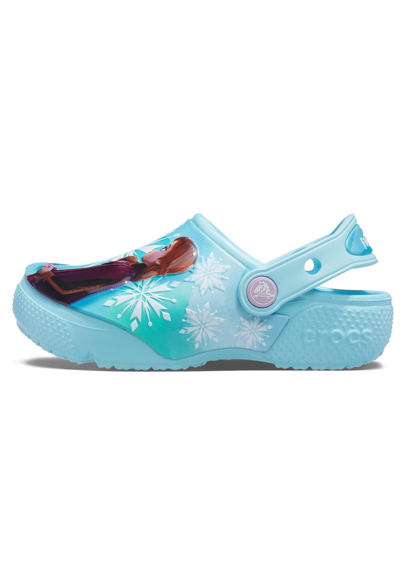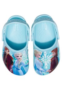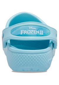 Sabot enfant bleu clair avec bride réglable au talon, ornée d'un imprimé personnage de Frozen et de motifs flocons de neige blancs.