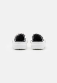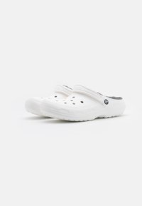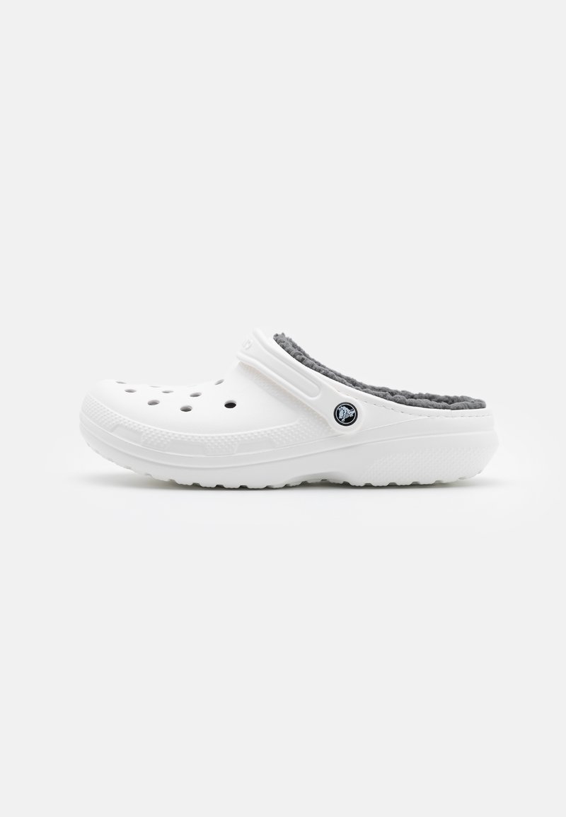 Sabot blanc avec une tige moulée, doublure en peluche grise et perforations pour la ventilation. Dispose d'une bande ajustable et d'une semelle texturée.