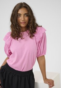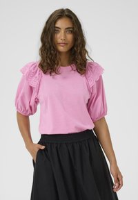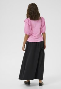 Femme aux cheveux bruns ondulés portant un haut rose à manches bouffantes avec des détails en dentelle et une jupe noire taille haute, posant avec une main dans la poche.