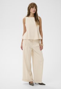 Femme portant un haut péplum blanc sans manches, un pantalon beige à jambes larges et des escarpins marron à talons bas, debout devant un fond blanc uni.