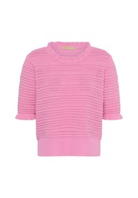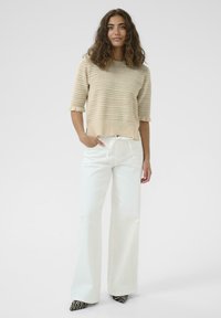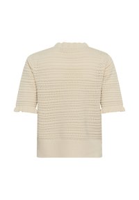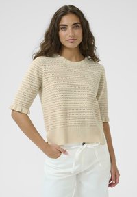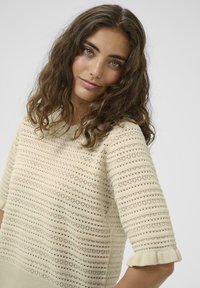 Pull en tricot beige avec manches courtes à volants, présentant un motif texturé de petits trous et de rayures horizontales. Porté avec un pantalon blanc.