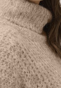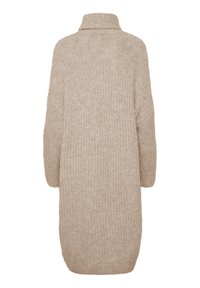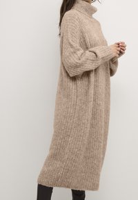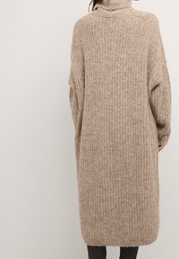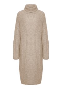Robe pull beige en tricot avec col montant, coupe oversize, manches longues et texture côtelée, associée à des bottines noires.