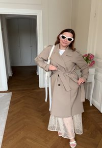 Femme portant un trench-coat beige, une jupe en dentelle blanche, des sandales blanches, des lunettes de soleil blanches et un sac à épaule, debout à l'intérieur près d'une table avec des fleurs.