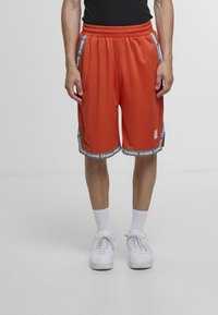 Shorts de basketball en maille orange avec un ourlet à rayures noires et blanches, ceinture élastique et petit logo sur le côté inférieur.