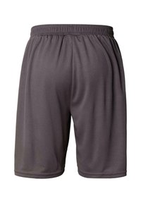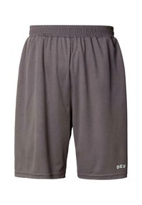 Homme portant un short gris arrivant aux genoux, des chaussettes blanches, des baskets blanches avec des rayures noires, et un débardeur blanc, debout devant un fond neutre.