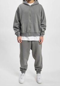 Homme portant un sweat à capuche gris avec fermeture éclair et poches avant, par-dessus un t-shirt blanc, avec un pantalon gris assorti visible en bas.