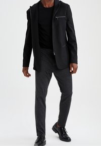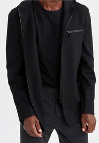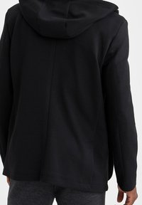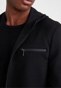 Veste à capuche noire en matière douce, dotée de poches poitrine et latérales zippées, avec une coupe décontractée et un col montant.