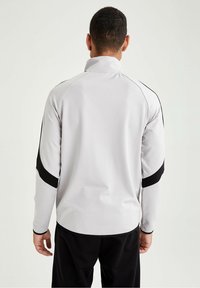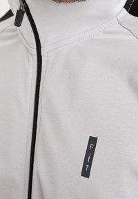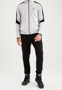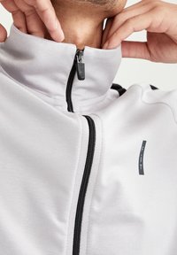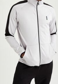 Veste zippée gris clair avec accents noirs, dotée de poches avant, d'un col montant, et d'une texture de tissu douce et lisse.