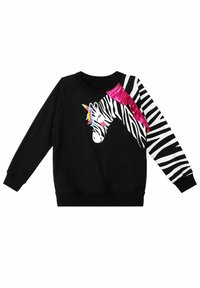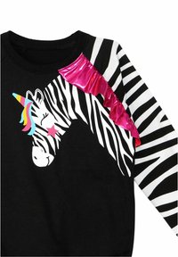 Sweat-shirt noir avec un motif zèbre et licorne, comprenant des accents colorés et un tissu rose froncé sur une manche. Détails rayés sur la manche.