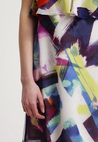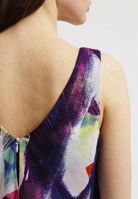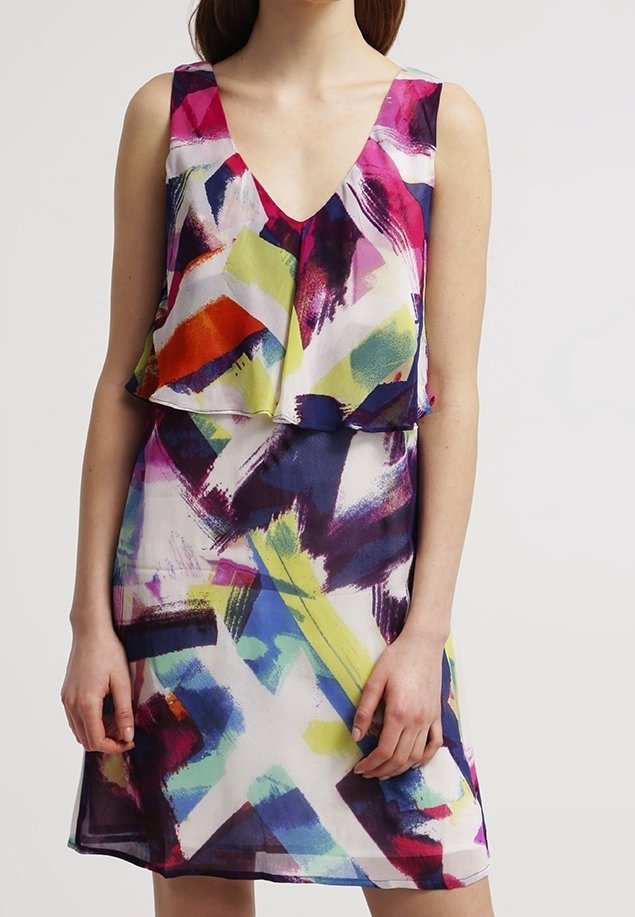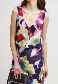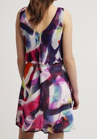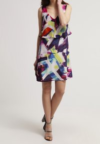 Robe sans manches colorée à col en V, présentant un motif abstrait en rose, jaune, violet et bleu. Tissu léger, coupe ample.