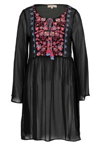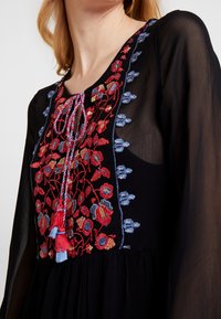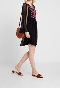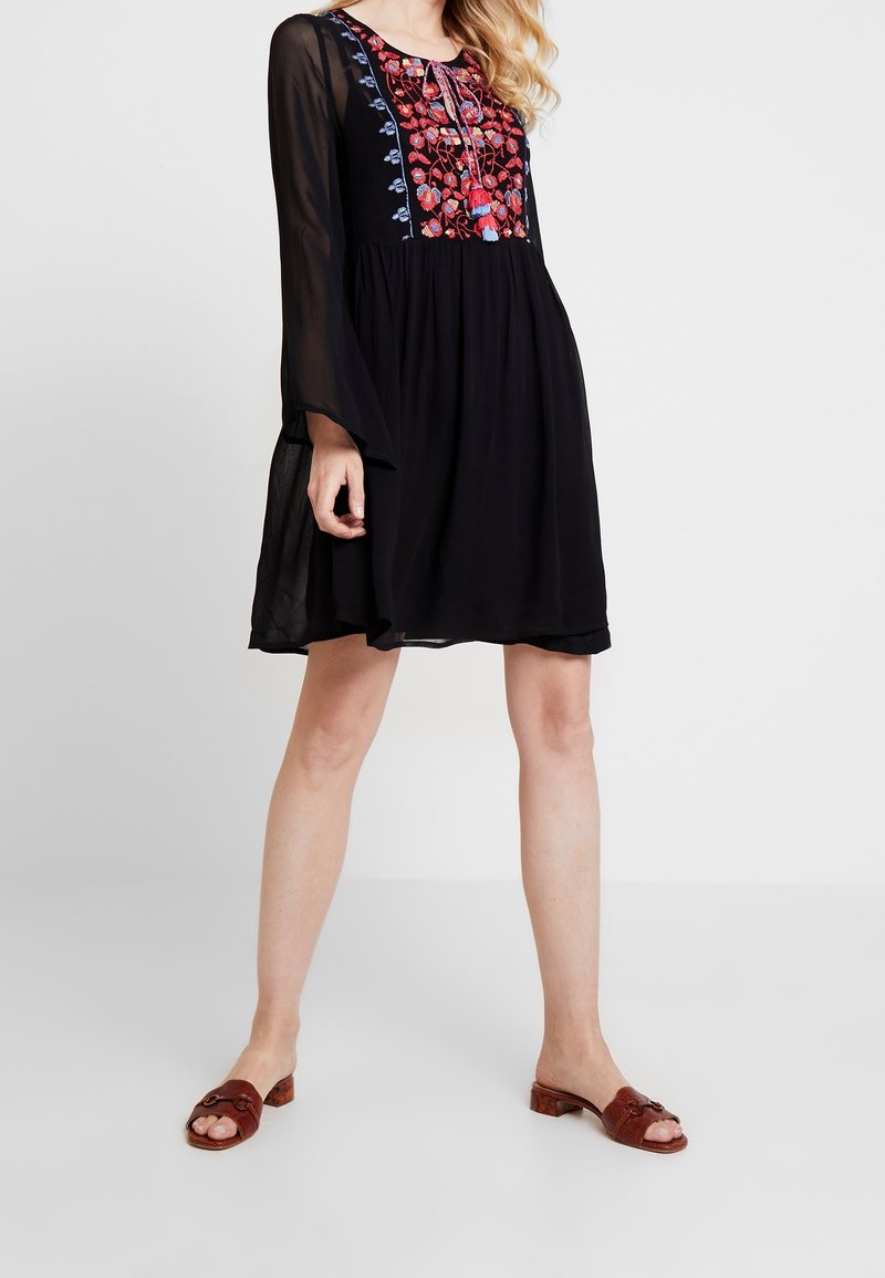 Robe noire sans manches avec un motif floral brodé en rouge et bleu sur le buste. Jupe fluide et matière transparente sur les manches. Sandales à talons carrés marron.