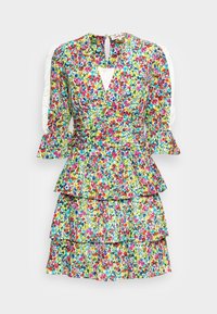 Robe florale colorée avec volants en étages, dotée d'un corsage ajusté, d'un décolleté en V et de manches évasées. Fabriquée en tissu léger avec un motif vibrant.