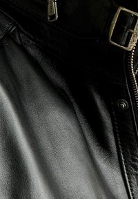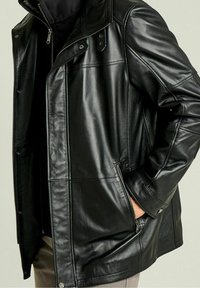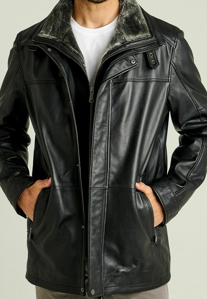 Homme portant une veste en cuir noire avec col doublé de fourrure, chemise blanche à l'intérieur, mains dans les poches avant zippées, debout devant un fond uni.