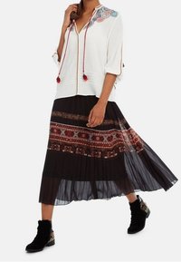 Femme portant un chemisier blanc avec une broderie circulaire colorée sur les épaules et des liens à pompons rouges, assorti à une jupe à motifs.