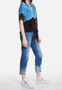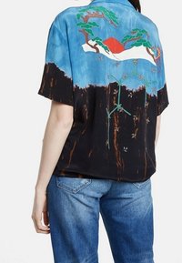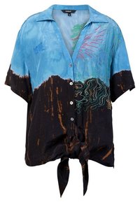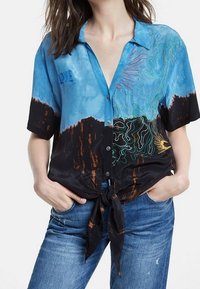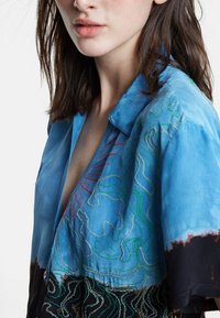 Chemise à manches courtes bleue et noire à boutons avec un nœud à l'avant. Présente un design en dégradé et des accents brodés en vert et rouge. Texture soyeuse.