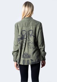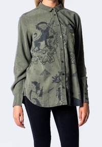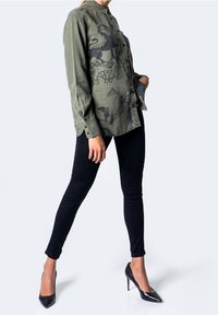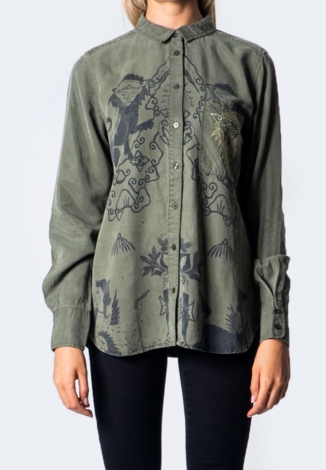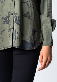 Chemise boutonnée à manches longues vert olive avec un imprimé abstrait noir et un petit détail de poche brodée, portée avec un pantalon noir.