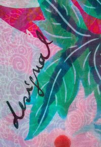 Écharpe légère avec des motifs floraux et géométriques vibrants en violet, rose, vert, bleu et rouge, bouclée avec les extrémités pendant vers le bas.