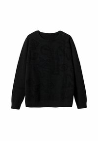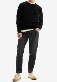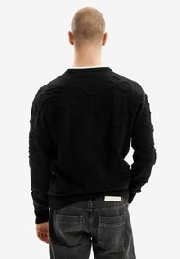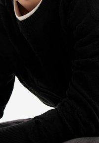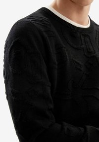 Pull noir texturé avec des motifs abstraits en relief, porté sur une chemise blanche, associé à un jean foncé, les mains posées sur les hanches.