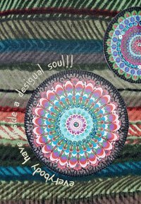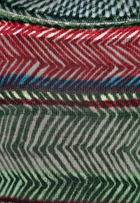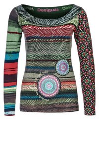 Haut à manches longues multicolore avec un décolleté plongeant, présentant des motifs variés de rayures, de dessins circulaires et un tissu texturé dans des tons de vert, rouge et bleu.