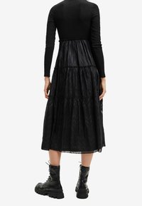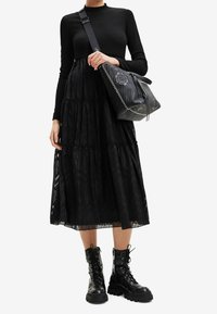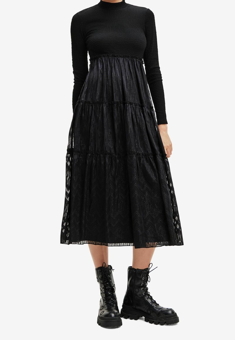 Robe noire à étages avec manches longues et corsage texturé, présentant un tissu transparent et des motifs géométriques ; associée à des bottes de combat noires à lacets.