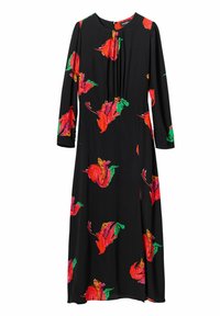 Robe noire à manches longues avec des motifs floraux rouges et verts vibrants, dotée d'une fente haute et d'un tissu doux et fluide.