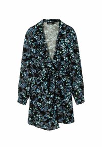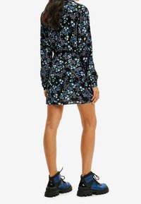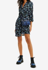 Robe florale noire avec des motifs bleus et verts, manches longues et taille cintrée. Associée à des bottes lacées bleu et noir.