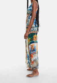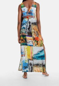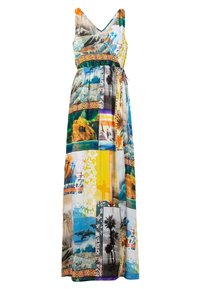 Robe longue avec un design patchwork aux couleurs vives, un col en V, des manches courtes et une taille cintrée pour une silhouette ajustée.