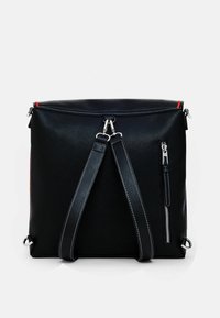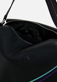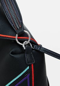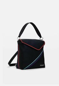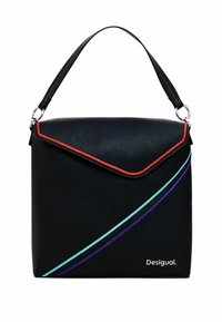 Sac à main noir avec rabat angulaire bordé de surpiqûres rouges, surpiqûres diagonales bleues et violettes sur le devant, et une anse unique.