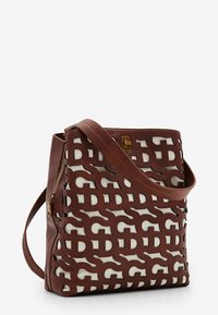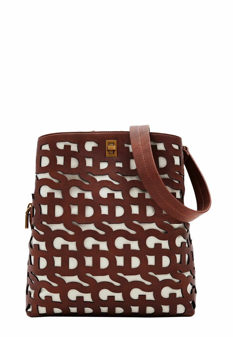 Sac bandoulière en cuir marron avec un motif répétitif d'entrelacs "D" et "T" sur fond blanc et une fermeture à bouton doré.