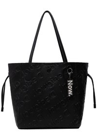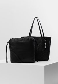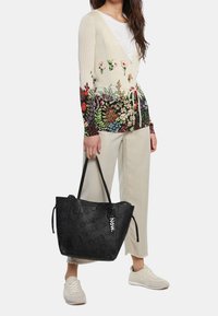 Femme portant un cardigan floral beige, un pantalon crème, des baskets blanches, tenant un grand sac fourre-tout noir embossé avec une étiquette "NOW".