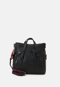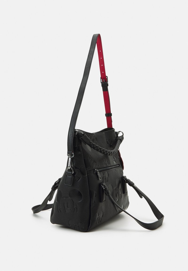 Sac à main en cuir noir avec motif Mickey Mouse embossé, poignée tressée, poche avant zippée et bandoulière ajustable noire et rouge.