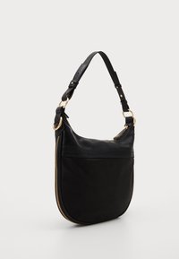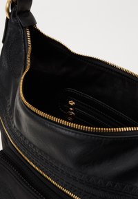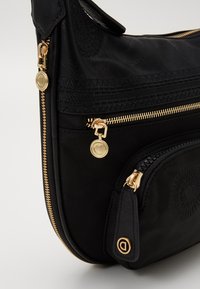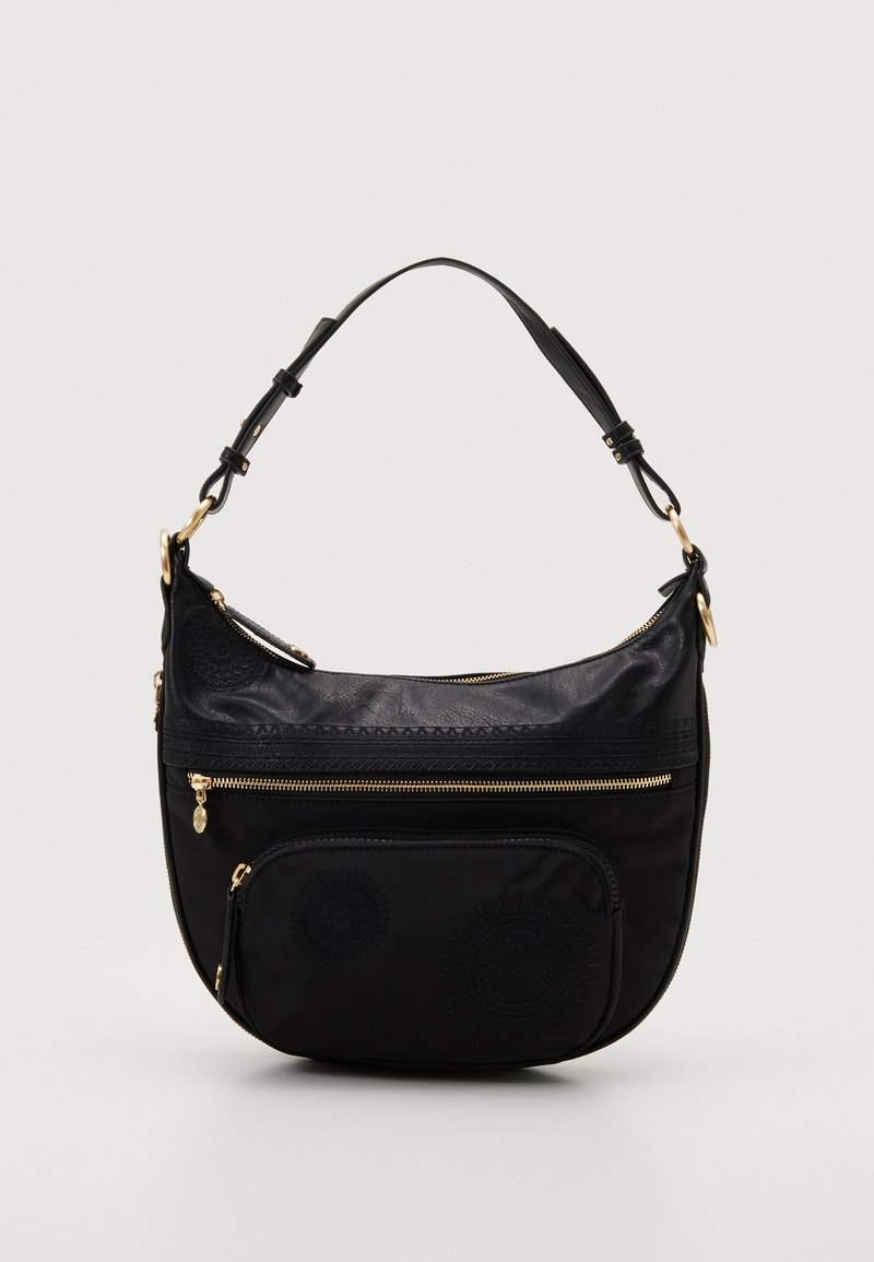 Sac à main noir en forme de croissant avec bandoulière réglable, fermetures éclair dorées et motifs circulaires en relief sur les poches avant.