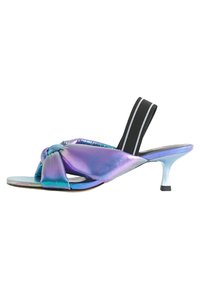 Sandales à talons avec un design à nœud torsadé, en matériau irisé bleu et violet, bout ouvert, et une lanière arrière noire rayée.