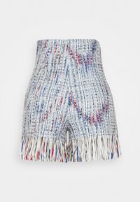 Shorts tissés taille haute avec un motif multicolore en bleu, rouge, blanc et marron, dotés d'un ourlet à franges.