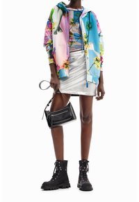 Femme portant un sweat à capuche à fleurs colorées, une mini-jupe argentée, des bottes de combat noires, tenant un petit sac à main noir à ses côtés.