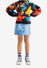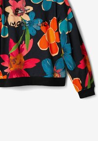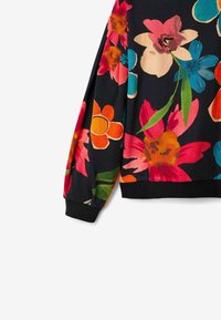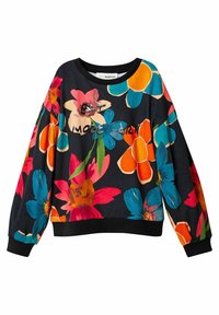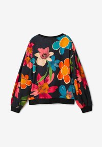 Sweatshirt noir avec des motifs floraux éclatants en rouge, rose, bleu et orange. Il a des poignets côtelés et un col rond. Assorti avec une jupe en denim.
