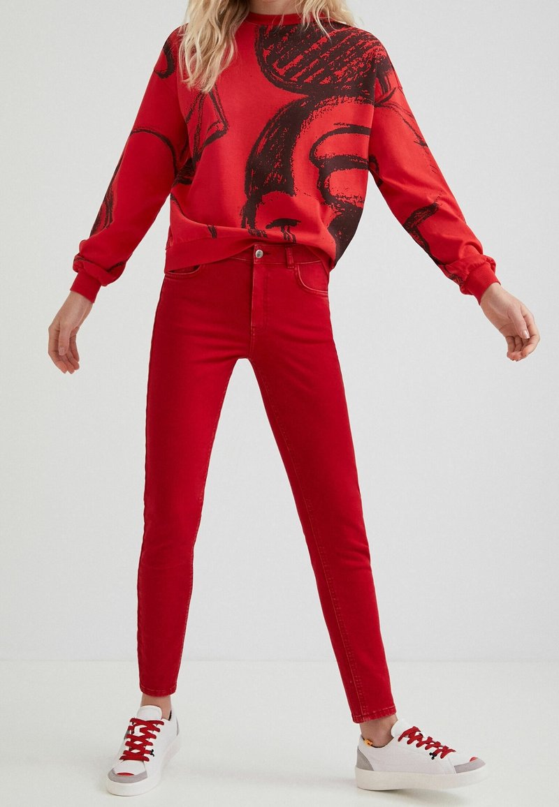 Personne portant un jean skinny taille haute rouge, un haut à manches longues rouge à motifs noirs, et des baskets blanches avec des lacets rouges, debout les jambes écartées.