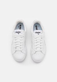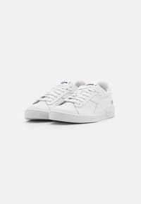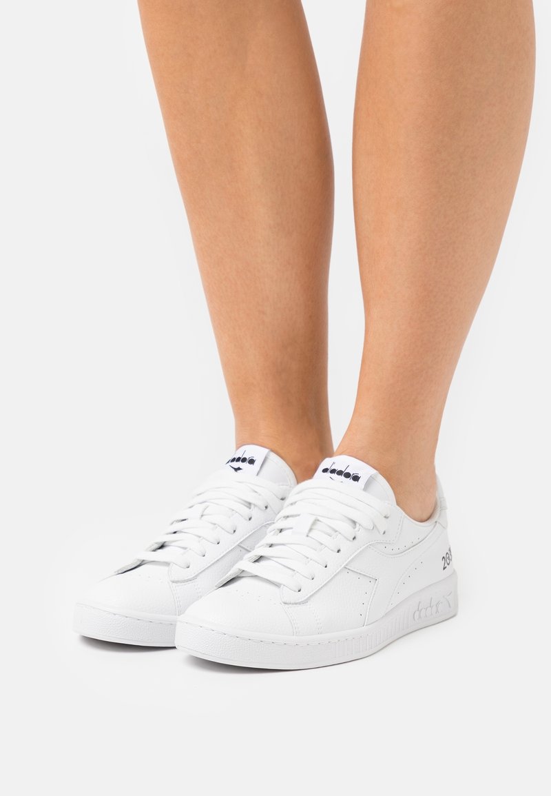 Baskets en cuir blanc avec semelles plates, design à lacets et marquage discret sur la languette et le côté. Texture lisse et apparence minimaliste.