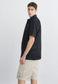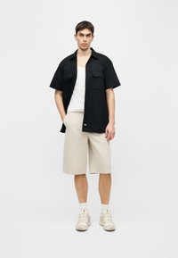 Jeune homme debout de profil portant une chemise noire à manches courtes et un short beige jusqu'aux genoux, sur un fond blanc uni.